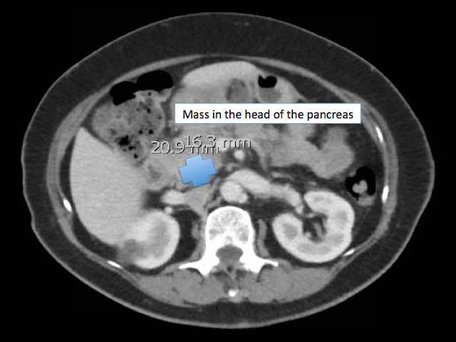 A subsequent endoscopic retrograde cholangiopancreatography (ERCP) revealed a dilated common bile duct and pancreatic duct but no significant intrahepatic biliary dilation. With ultrasound a hypoechoic 24 X 23 mm mass was seen in the head of pancreas with upstream dilation of both ducts. Vessels looked clear of the mass. Small amount of ascites noted. Small peritumor lymph node seen.